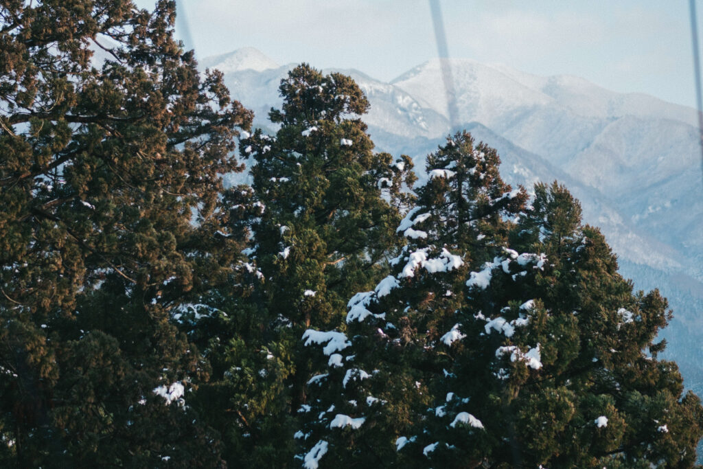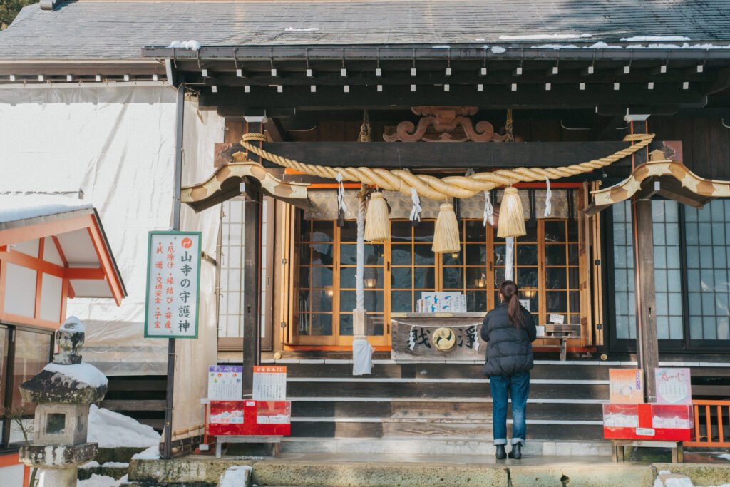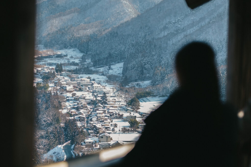 หลังจากเดินอยู่ไม่นานเราก็ขึ้นมายังจุดชมวิวบนยอดเขาตั้งอยู่ท่ามกลางป่า และหิมะขาวโพลนในฤดูหนาว โดยวิวตรงนี้เราจะสามารภมองเห็นหมู่บ้าน และหุบเขาได้แบบพาโนรามา ยิ่งช่วงเย็นเค้าบอกว่าที่นี่จะสวยมาก ไม่แปลกใจเลยว่าทำไมทุกคนถึงยกให้ Yamadera เป็นอีกหนึ่งจุดเช็กอินที่ควรมีในลิสต์ทริปโทโฮคุ
