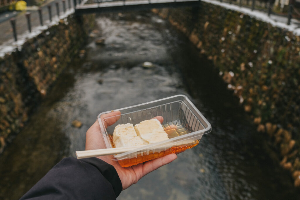 มาถึงที่นี่เราขอแนะนำให้ต้องแวะชิมร้านเต้าหู้เก่าแก่กว่า 100 ปีที่ตั้งอยู่ตรงทางเข้าหมู่บ้าน ตัวร้านเป็นบ้านไม้ที่มีบรรยากาศอบอุ่นแบบญี่ปุ่นดั้งเดิม จุดเด่นที่นี่คือเต้าหู้สดที่ทำกันใหม่ทุกเช้า เราขอแนะนำเมนู Nama Tofu ที่จะเป็นเต้าหูเย็นเนื้อเนียนนุ่มราดโชยุหอม ๆ รับรองว่าทุกคนต้องติดใจแบบเราแน่นอน