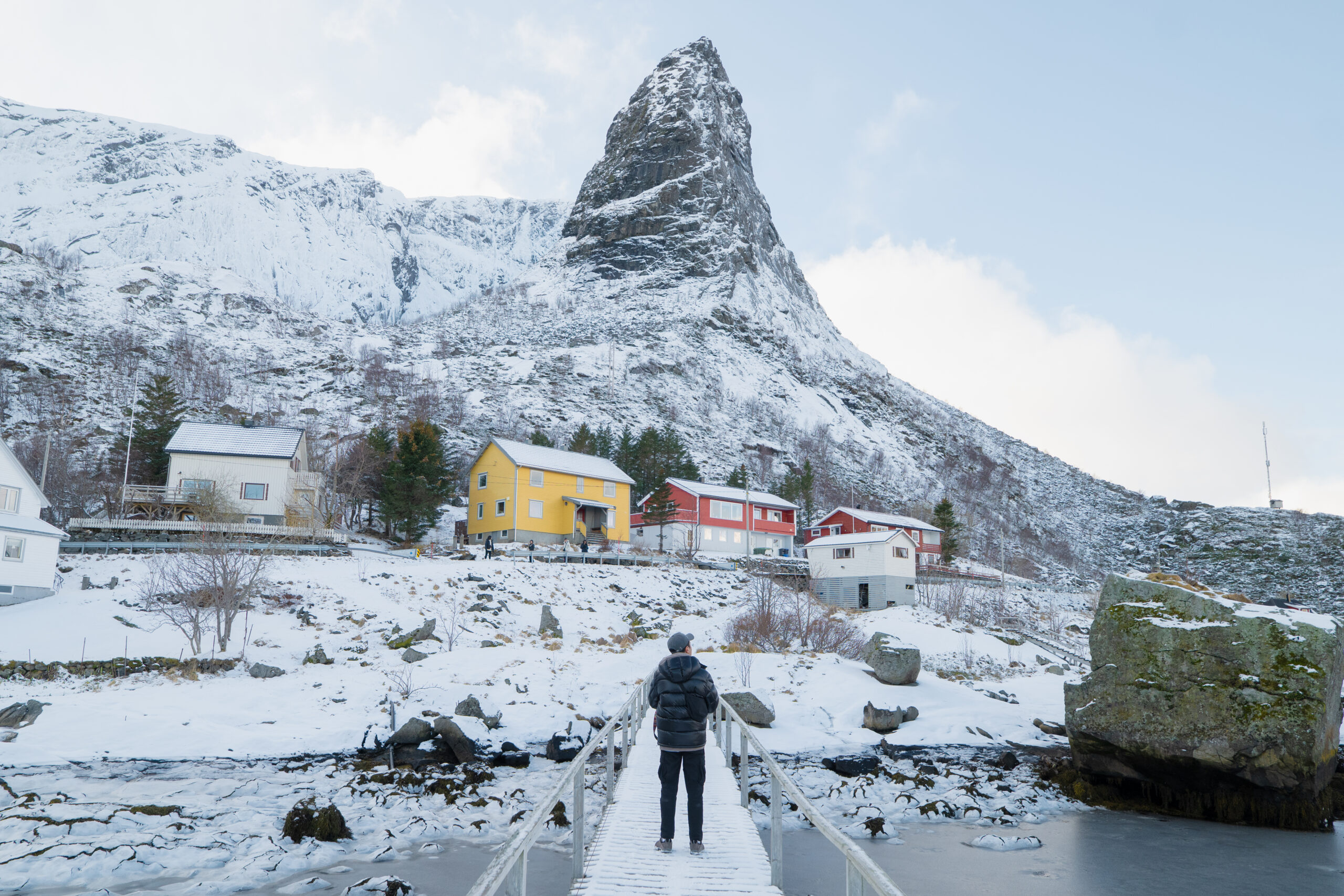 ขับมาอีกนิดเราจะแวะจอดรถลงไปถ่ายกับจุดชมวิวภูเขาสูงทรงแปลกประหลาดอย่าง Horn กันต่อ โดยที่นี่มาพร้อมกับวิวหิมะฟู ๆ ยิ่งตรงสะพานนี้เป็นหนึ่งในมุมยอดฮิตของ Lofoten เลย