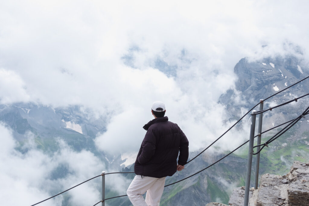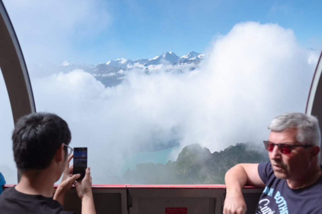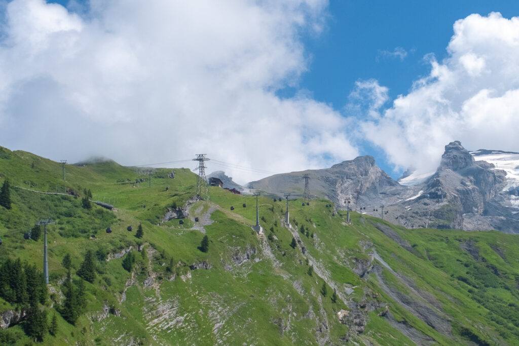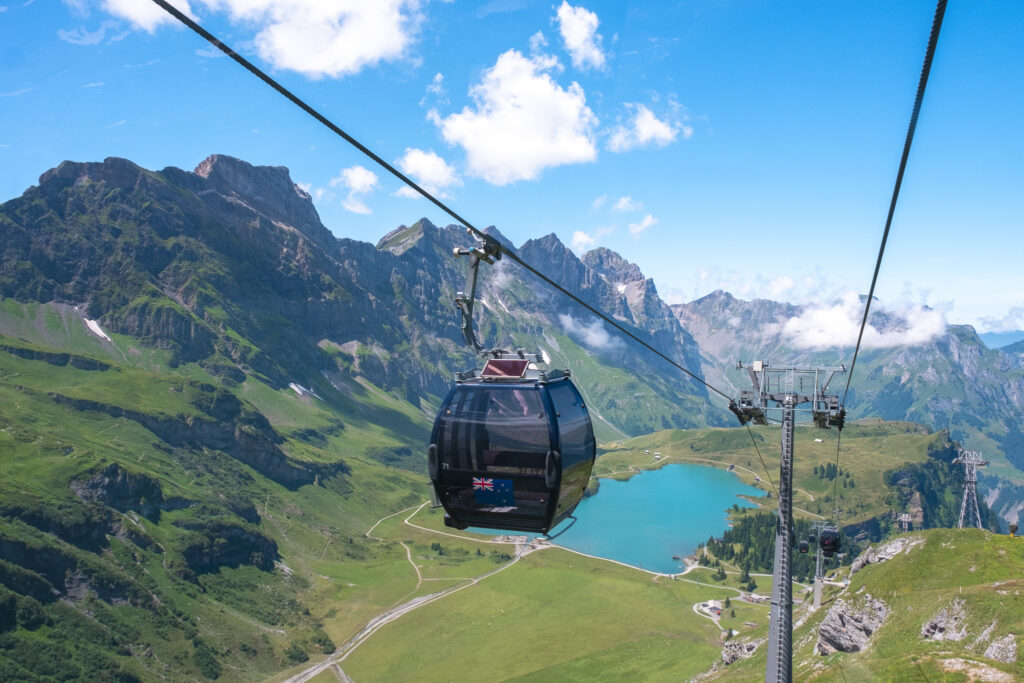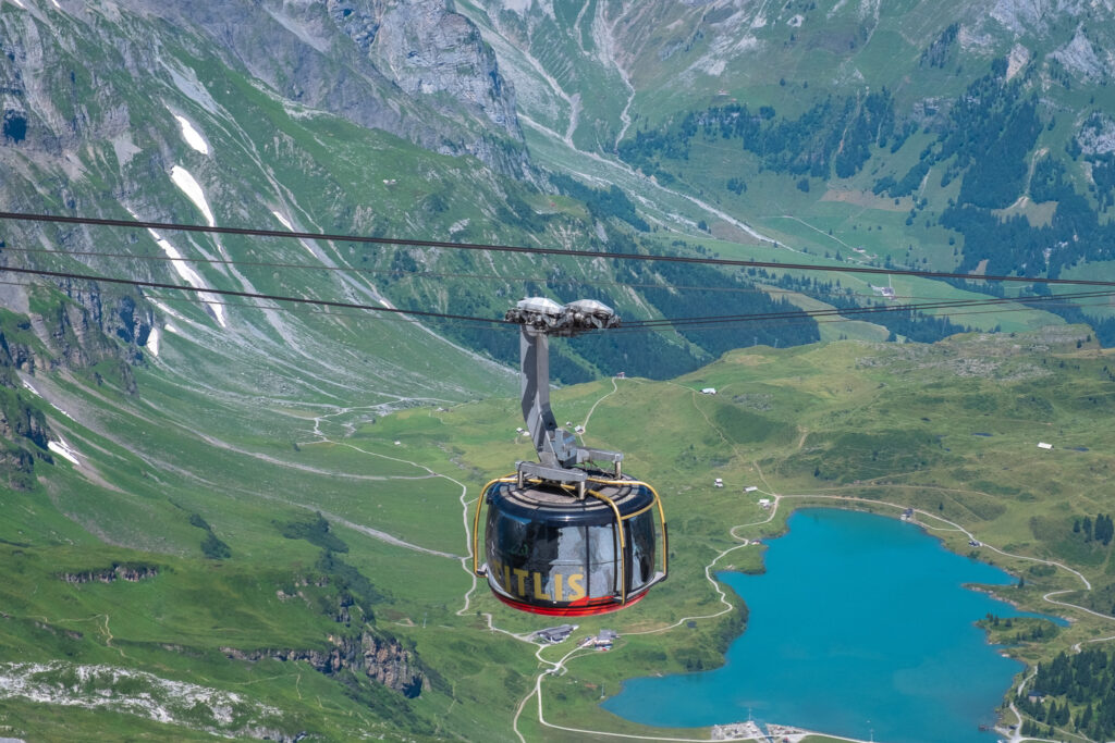 เริ่มต้นเช้าวันใหม่ด้วยความสดใสแบบเต็มพลัง เรานั่งรถไฟจาก Interlaken มุ่งหน้าสู่เมือง Engelberg จุดเริ่มต้นของการขึ้น Titlis หนึ่งในยอดเขาที่มีชื่อเสียงที่สุดของสวิตเซอร์แลนด์ แม้จะเป็นช่วงซัมเมอร์ แต่ที่นี่คือดินแดนแห่งน้ำแข็งตลอดทั้งปี เส้นทางขึ้นเขามีสองช่วง คือการนั่งกระเช้าขนาดเล็กจาก Engelberg ไปยัง Trübsee และต่อด้วย Titlis Rotair กระเช้าหมุนรอบ 360 องศาที่พาเราขึ้นไปสู่ยอดเขา ระหว่างทางคือวิวที่ค่อย ๆ เปลี่ยนจากทุ่งหญ้าเขียวขจีเป็นภูเขาหิมะสุดอลังการ