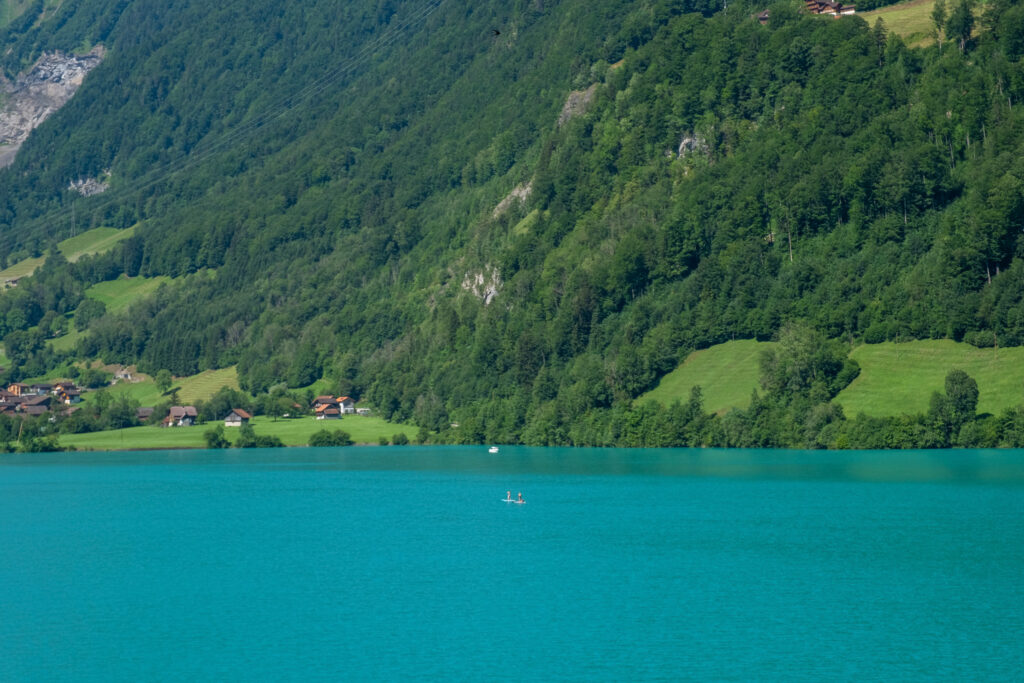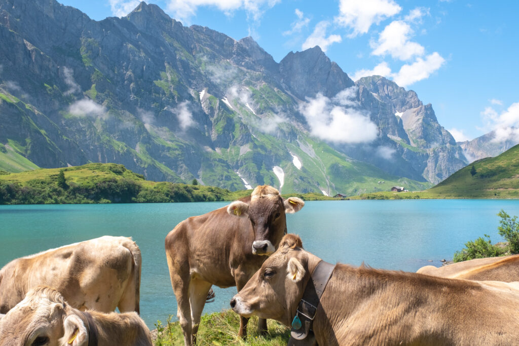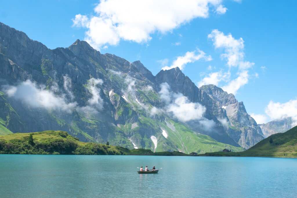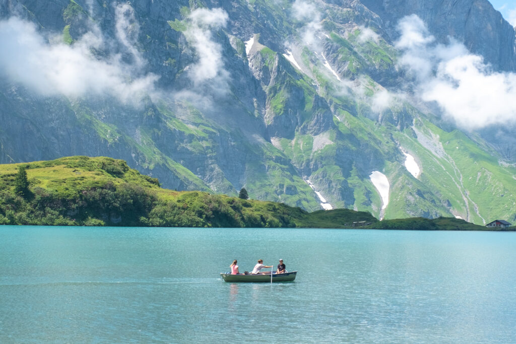 ส่วนขากลับจาก Titlis เราไม่พลาดที่จะขอลงที่สถานี Trübsee เพื่อสัมผัสอีกมุมของธรรมชาติสวย ๆ ในฤดูร้อน เพราะพอลงจากกระเช้ามาปุ๊บก็เจอกับ Trübsee Lake ทะเลสาบสีฟ้าใสที่โอบล้อมด้วยภูเขาสีเขียวแบบไม่มีอะไรมาบังมาพร้อมบรรยากาศที่นี่ชิลล์ มีน้องวัวเดินเล็มหญ้าพร้อมมีเสียงกระดิ่งเบา ๆ อยู่เต็มไปหมด แถมที่นี่ไม่ใช่แค่สวยอย่างเดียวนะ แต่ยังมีกิจกรรมสนุก ๆ อย่างเรือพายออกไปกลางทะเลสาบได้อีกด้วย ฟีลแบบอยากนอนมองท้องฟ้า แล้วสูดอากาศดี ๆ ให้เต็มปอด ไม่อยากรีบกลับไปไหนเลยจริง ๆ