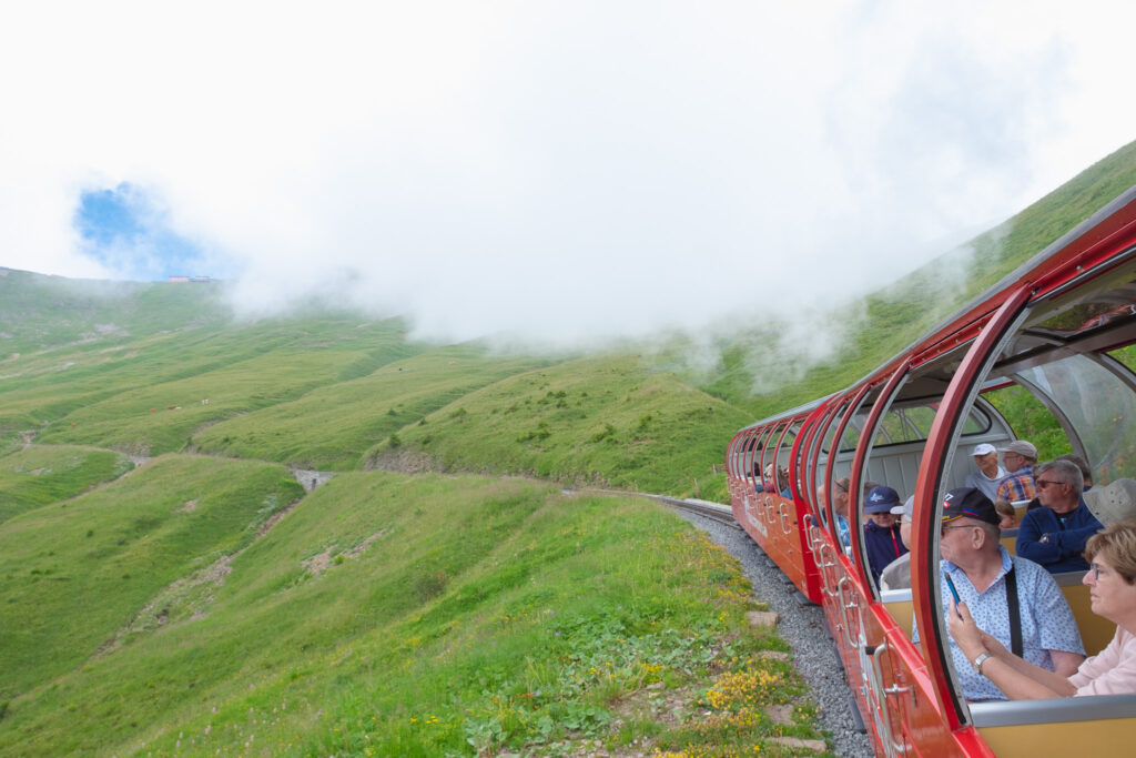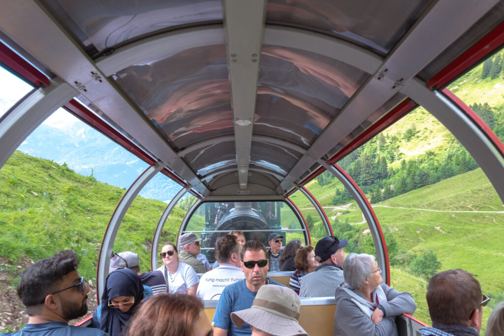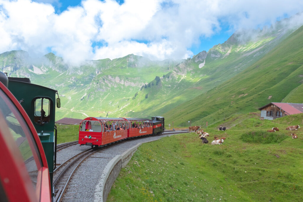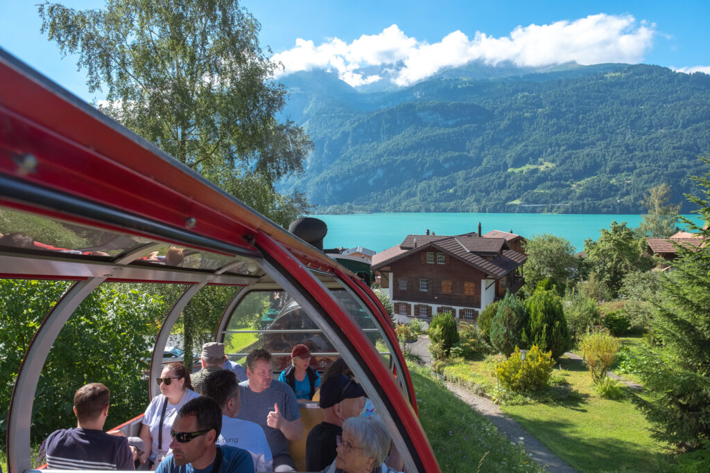 จาก Lake Lungern เรานั่งรถไฟต่อไม่นานก็มาถึงอีกหนึ่งจุดคลาสสิกที่สายรถไฟห้ามพลาดสุด ๆ เลยกับ Brienzer Rothorn Bahn รถไฟไอน้ำสายเก่าแก่ที่จะพาเราค่อย ๆ ไต่ขึ้นไปยังยอดเขา Brienzer Rothorn แบบช้า ๆ ตัวรถไฟสีแดงสดสุดวินเทจ ค่อย ๆ เคลื่อนผ่านทุ่งหญ้า ป่าเขียว และหน้าผาสูงชัน โดยมีฉากหลังเป็นทะเลสาบ Brienz สีฟ้าน้ำทะเลที่สวยจนต้องหายใจลึก ๆ ทุกครั้งที่มองเป็นสายรถไฟที่เราชอบที่สุดในทริปนี้แล้ว ยิ่งฤดูร้อนเรายิ่งชอบที่นี่ที่เพราะบรรยากาศบนเขาจะเย็นสบายมาก วิวก็เปลี่ยนไปเรื่อย ๆ จากหมู่บ้านริมทะเลสาบไปจนถึงยอดเขาที่มีหิมะหลงเหลืออยู่บ้าง