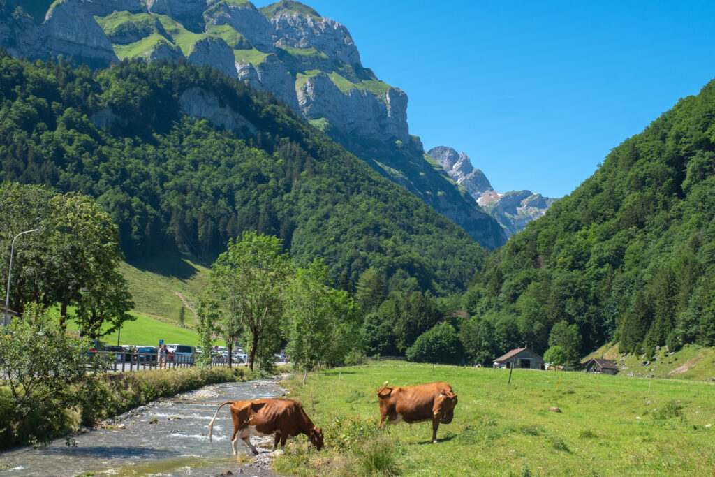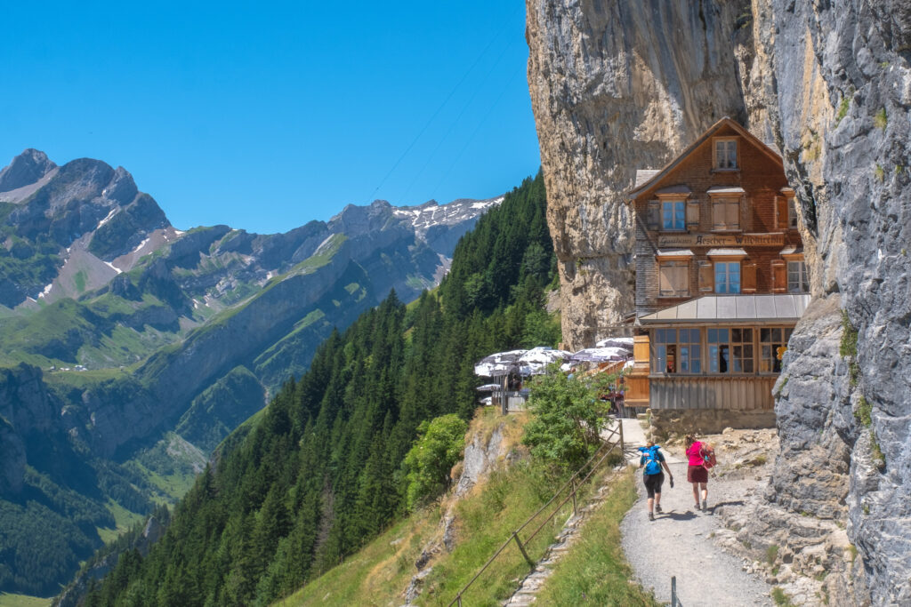 วันนี้เราขอออกนอกแพลนยอดฮิตไปสู่จุดหมายลับ ๆ แถบ Appenzell ที่หลายคนยังไม่เคยรู้จัก แต่ความสวยบอกเลยว่าระดับเวิลด์คลาส นั่นคือ Wildkirchli ที่มาพร้อมเส้นทาง hiking บนสันเขาที่วิวอลังการสุด ๆ โดยเริ่มต้นหลังจากลงรถไฟเราขึ้น cable car จาก Wasserauen สู่ Ebenalp แล้วเริ่มต้นเส้นทางเดินเท้าสั้น ๆ ได้เลย ทางเดินเลียบหน้าผาเราจะได้เห็นน้องวัวกินหญ้าสองข้างทางก่อนจะโผล่ออกมาสู่จุดชมวิวด้านนอกที่เห็น Aescher Cliff Restaurant ตั้งอยู่บนหน้าผาแบบไกล ๆ