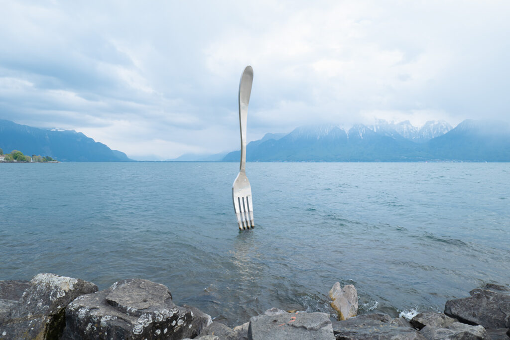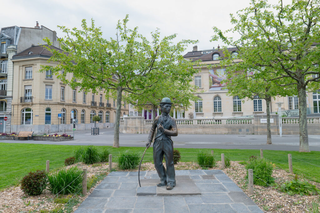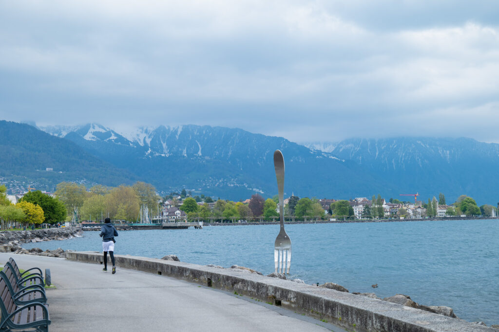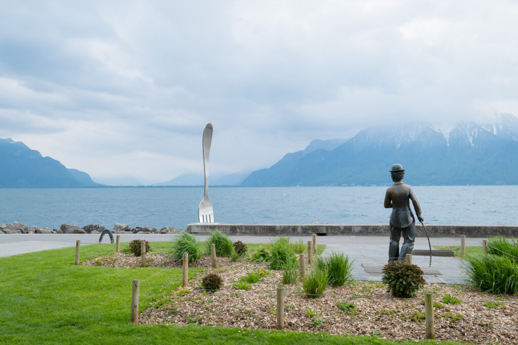 หลังจากชมความยิ่งใหญ่ของปราสาท Chillon เรานั่งรถไฟต่อมาไม่ไกลก็มาถึง Vevey เมืองเล็กริมทะเลสาบที่เต็มไปด้วยความน่ารัก และบรรยากาศสุดชิลล์ ตัวเมืองเงียบกว่า Montreux แต่กลับอบอุ่นยิ่งกว่า ตัวตึกสีอ่อนเรียงรายอยู่ริมฝั่งทะเลสาบ ล้อมรอบด้วยร้านกาแฟเล็ก ๆ และที่นั่งปิกนิกใต้ต้นไม้ใหญ่ ไฮไลต์ที่ไม่ควรพลาดคือ รูปปั้น Charlie Chaplin ที่นั่งอยู่ริมทะเลสาบพร้อมกับ “ช้อนยักษ์” ที่ปักอยู่กลางน้ำ เป็นสัญลักษณ์ประจำเมืองที่ใครมา Vevey แล้วไม่ถ่ายรูปกับช้อนคือต้องมาใหม่อีกรอบนะ และที่ชอบที่สุดเลยคือบรรยากาศริมทะเลสาบช่วงบ่ายคือดีมาก ลมเย็น ๆ แดดนุ่ม ๆ กับวิวภูเขา และน้ำใสแบบตะโกน เป็นอีกหนึ่งเมืองที่ไม่ต้องมีแผนก็เดินเพลินได้ทั้งวัน