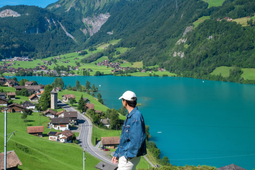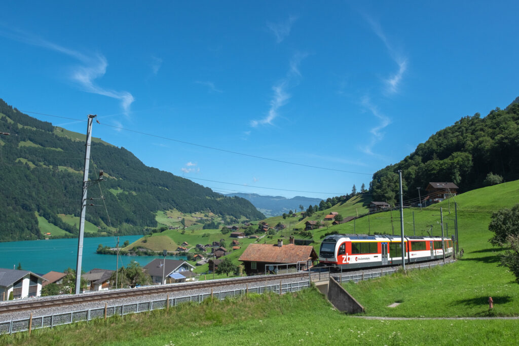 เช้าวันที่สองวันนี้เราออกเดินทางแต่เช้าหน่อยเพื่อไปยัง Lake Lungern ที่จุดหมายที่ไม่ใช่แค่ทะเลสาบธรรมดา แต่เป็นหนึ่งในมุมยอดฮิตสำหรับคนที่ชอบดูรถไฟ โดยเส้นทางรถไฟสาย Zentralbahn ที่วิ่งผ่านที่นี่เป็นไฮไลต์สุดคลาสสิก ตัวขบวนสีแดงค่อย ๆ เคลื่อนตัวไปตามรางที่ลัดเลาะทะเลสาบสีเขียวใสสะท้อนภูเขา และหมู่บ้านเล็ก ๆ ที่ซ่อนอยู่ในเงาเขา เป็นภาพที่ได้เห็นของจริงแล้ว ไม่แปลกใจเลยว่าทำไมทุกคนที่มาถึงชอบมุมนี้กัน ยิ่งอากาศตอนเช้าสดชื่นมากแถมได้เห็นกิจกรรมของคนที่นี่อีกด้วย