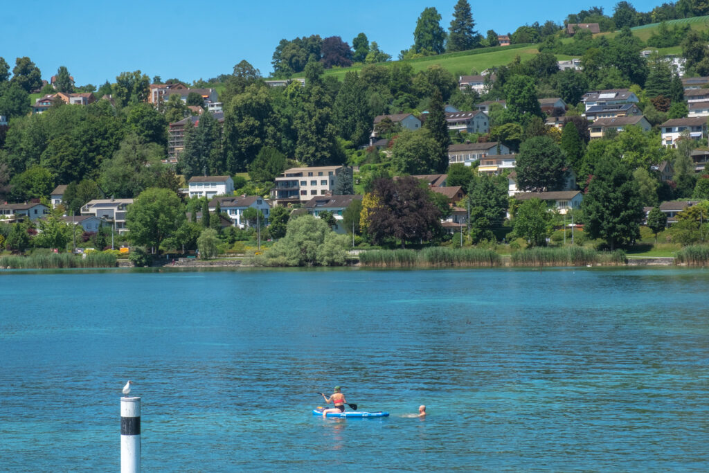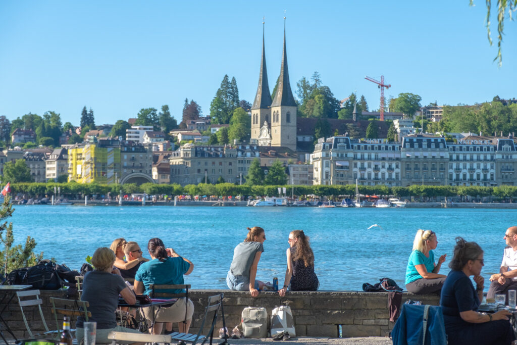 หลังจากเต็มอิ่มกับธรรมชาติที่ Trübsee เราก็นั่งรถไฟมาถึง Luzern ในช่วงเย็น อยากบอกเลยว่าการเดินเล่นเลียบทะเลสาบที่นี่คือการพักใจที่สุดฮีลใจเลย เพราะถนนเรียบฝั่งแม่น้ำนี้เต็มไปด้วยนักท่องเที่ยว และผู้คนที่ออกมานั่งชิลล์ ๆ ปิกนิกบนสนามหญ้าวางผ้าปู นั่งอ่านหนังสือ จิบไวน์ พูดคุยกับเพื่อน ๆ พร้อมเสียงหัวเราะ หรือพายเรือกันแบบครึกครืน อย่างที่บอกช่วง Summer บรรยากาศที่นี่คืออบอุ่น และมีชีวิตชีวาสุด ๆ เราชอบ Vibes เมืองแบบนี้มาก