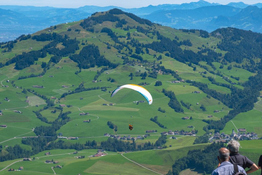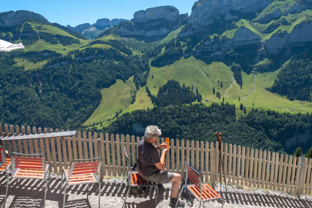 ไฮไลต์ที่เราชอบสุด ๆ คือตรง Aescher Restaurant ที่สร้างอยู่ริมหน้าผายิ่งมาช่วงกลางวันคือ Vibes ดีมาก มีแค่เก้าอี้ไม้โต๊ะเก่า ๆ กับวิวหลักล้านที่อยู่ข้างหน้า ข้าง ๆ มีคนจิบเบียร์ ทานซุป ขณะที่ด้านล่างเป็นผาสูงชันโอบล้อมไปด้วยเทือกเขาและผู้คนที่ต่างเดิน Hiking กัน เราหยุดพักตรงนี้แล้วนั่งจิบเครื่องเบา ๆ เอาจริง ๆ สำหรับคนที่ไม่อยากเดินลงไปข้างล่างแบบนี้ แค่มานั่งปล่อยใจตรงนี้ก็คือว่าคุ้มมากแล้วนะ