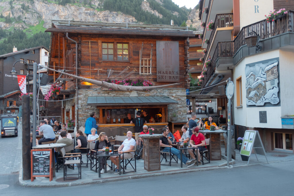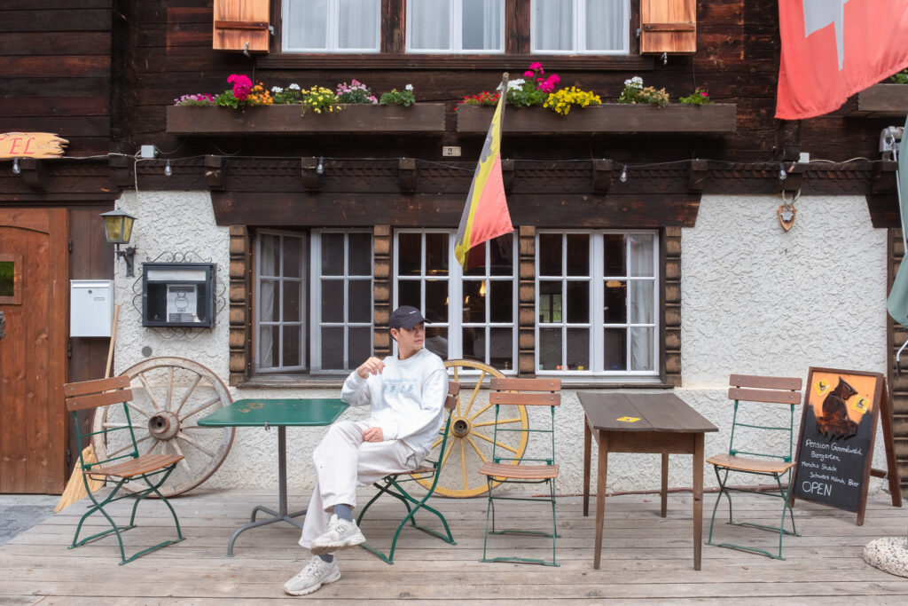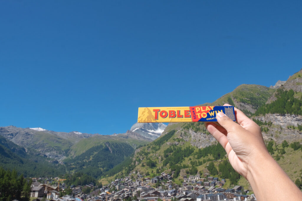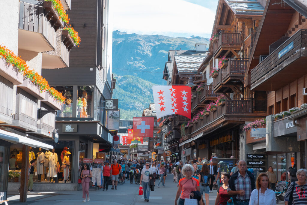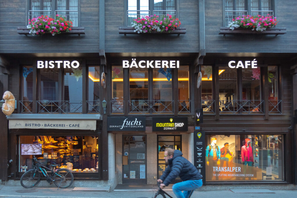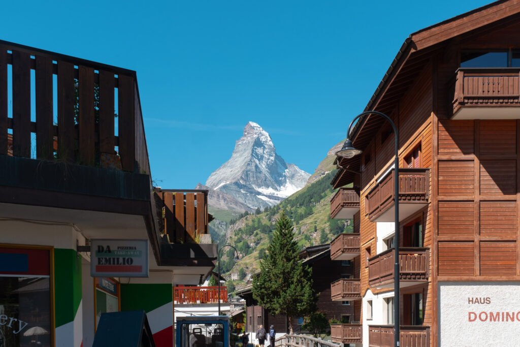 พอเราเดินออกมาจากสถานีก็เจอถนนสายหลักของเมืองที่รายล้อมด้วยร้านเบเกอรี่ คาเฟ่เล็ก ๆ โรงแรมไม้สไตล์ชาเลต์ และรถไฟฟ้าคันจิ๋วที่แล่นผ่านไปมา ตัวบ้านเรือนที่นี่น่ารักมากหลังคาไม้แหลม ๆ กับระเบียงที่เต็มไปด้วยดอกไม้สีสด บรรยากาศช่วงซัมเมอร์แบบนี้คือสดใสสุด ๆ ฟ้าใส แดดอุ่น ลมเบา ๆ และกลิ่นอบขนมปังลอยมาเป็นระยะ ๆ ไม่ต้องมีกิจกรรมอะไรมากก็รู้สึกว่าได้พักอย่างแท้จริง เดินเล่นช้า ๆ ตามถนนสายหลัก แวะซื้อช็อกโกแลตพื้นเมือง หรือหามุมเงียบ ๆ นั่งจิบกาแฟพร้อมมองยอด Matterhorn ก็ฟินแล้วจริง ๆ