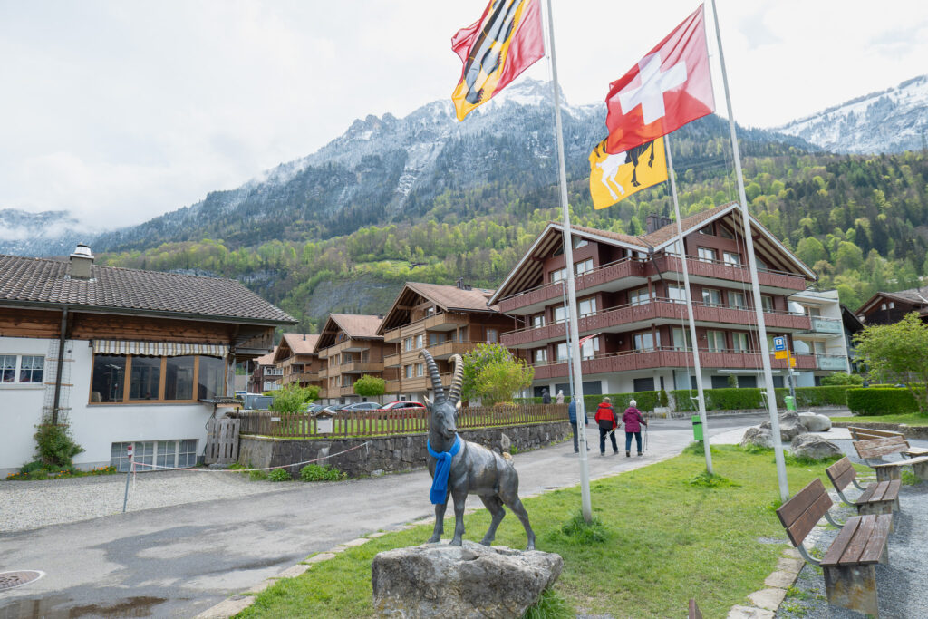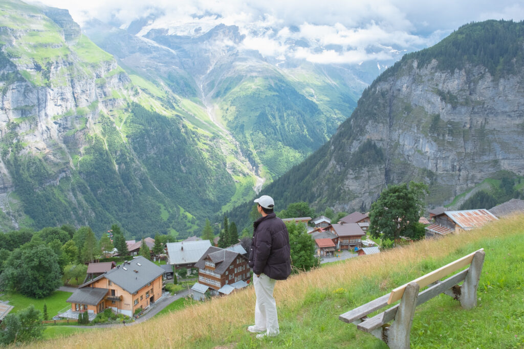 อีกหนึ่งไฮไลต์ที่กาดอกจันเลยว่าห้ามพลาดเด็ดขาดกับ Gimmelwald หมู่บ้านเล็ก ๆ ที่อยู่ระหว่างทางลงจาก Schilthorn ไปยัง Mürren ที่มีบรรยากาศเงียบกว่า Mürren อีก ที่นี่ไม่มีร้านหรู ไม่มีอะไรหวือหวา มีแค่บ้านไม้หลังเก่า ๆ ฟาร์มวัว ทุ่งหญ้ากว้าง และวิวภูเขาอลังการแบบไม่มีคนบัง เหมาะกับการเดินช้า ๆ ถ่ายรูปใบไม้ ดอกไม้ หรือแค่หยุดนั่งบนม้านั่งแล้วปล่อยใจ ยิ่งหน้าร้อนแบบนี้คือช่วงเวลาที่นี่สวยที่สุดเลย ดอกไม้เริ่มบานตามทางเดิน เสียงวัวกระดิ่งดังเป็นจังหวะเบา ๆ เหมาะสำหรับสายชิลล์ที่อยากใกล้ธรรมชาติแบบสุด ๆ เลยแหละ