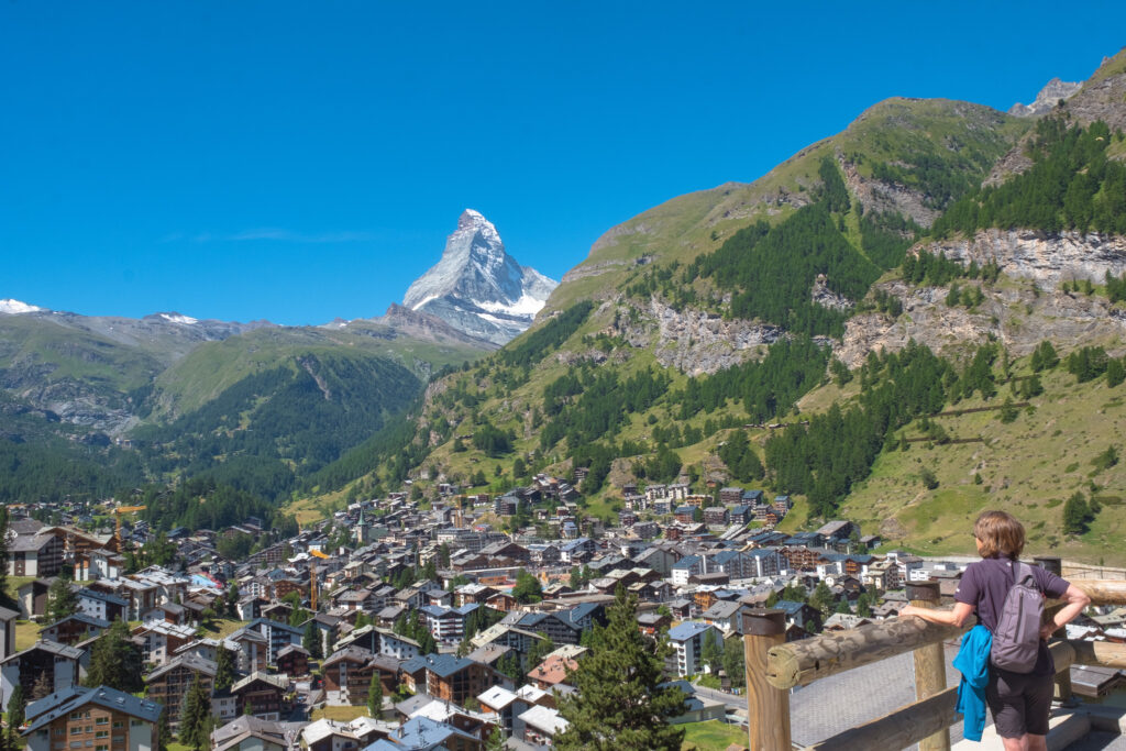ส่วนใครอยากเห็นวิวเมืองนี้แบบเต็มตาเราขอแนะนำให้ออกแรงเดินขึ้นมายัง Viewpoint โดยมุมนี้เราจะได้เห็นเมือง Zermatt ที่มียอดเขา Matterhorn เป็นฉากหลังที่สวยมาก ยิ่งช่วงวันไหนฟ้าสวยเห็นยอดเขาได้แบบไม่มีเมฆมาบัง มันคือวิวที่เรายกให้สวยที่สุดในทริปนี้เลย