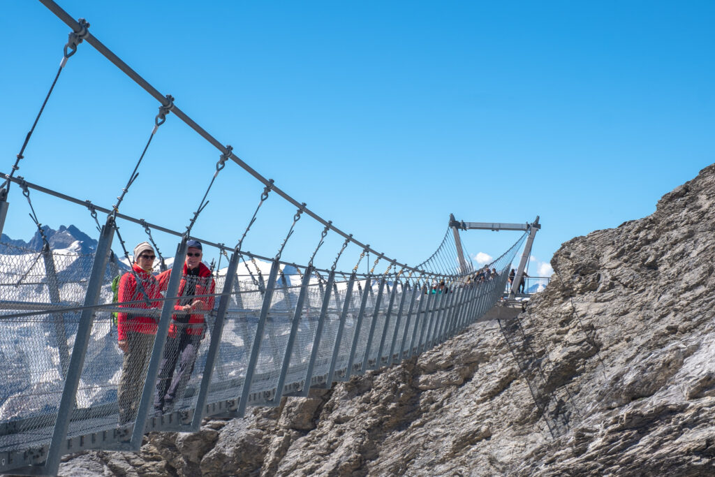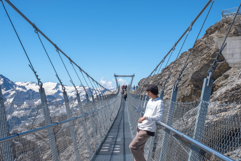 เมื่อเราถึงด้านบนก็อุทานเลยว่าทำไมมันเหมือนคนละโลกเลย จากทุ่งหญ้าสู่ยอดเขาที่มีหิมะขาวโพลนบรรยากาศดีมาก นอกจากนี้ยังมีมุมไฮไลต์อย่างสะพานแขวนที่ยาวที่สุดในยุโรปอย่าง Titlis Cliff Walk ให้เราได้ถ่ายรูปและลองเดินเล่นอีกด้วย ใครอยากเจอหิมะฟิน ๆ ในช่วงซัมเมอร์บอกเลยว่าที่นี่ไม่ทำให้ผิดหวังแน่นอน