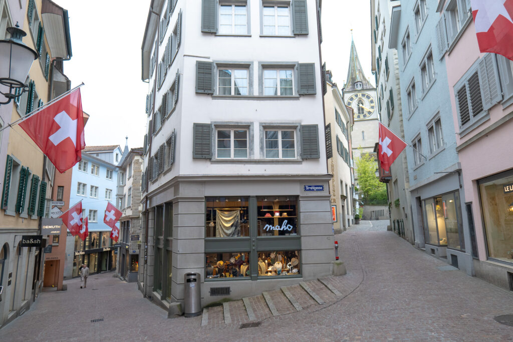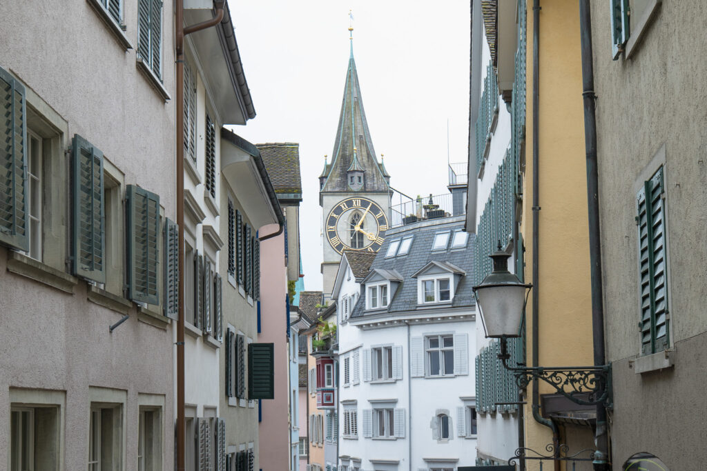 หลังจากปล่อยใจไปกับบรรยากาศริมแม่น้ำ เราเดินต่อเข้ามาใน Old Town ของ Zurich ที่เต็มไปด้วยถนนหินเล็ก ๆ โค้งไปมาแทรกตัวอยู่ระหว่างอาคารเก่าแก่สีพาสเทล ตึกแต่ละหลังมีเอกลักษณ์ทั้งหน้าต่างไม้ บานประตูแกะสลัก และลายเพนต์โบราณที่ยังคงถูกรักษาไว้อย่างดี มีเสียงดนตรีสดจากมุมนึงของถนน กับกลิ่นหอมของขนมปังอบใหม่ที่ลอยมาจากร้านเบเกอรี่เล็ก ๆ ข้างทาง ผู้คนเดินช้า ๆ ถือเจลาโต้บ้าง แวะร้านขายของแฮนด์เมดบ้าง ทุกมุมของย่านนี้ ใครที่ชอบเดินเล่นในเมืองต้องชอบบรรยากาศแบบนี้แน่นอน